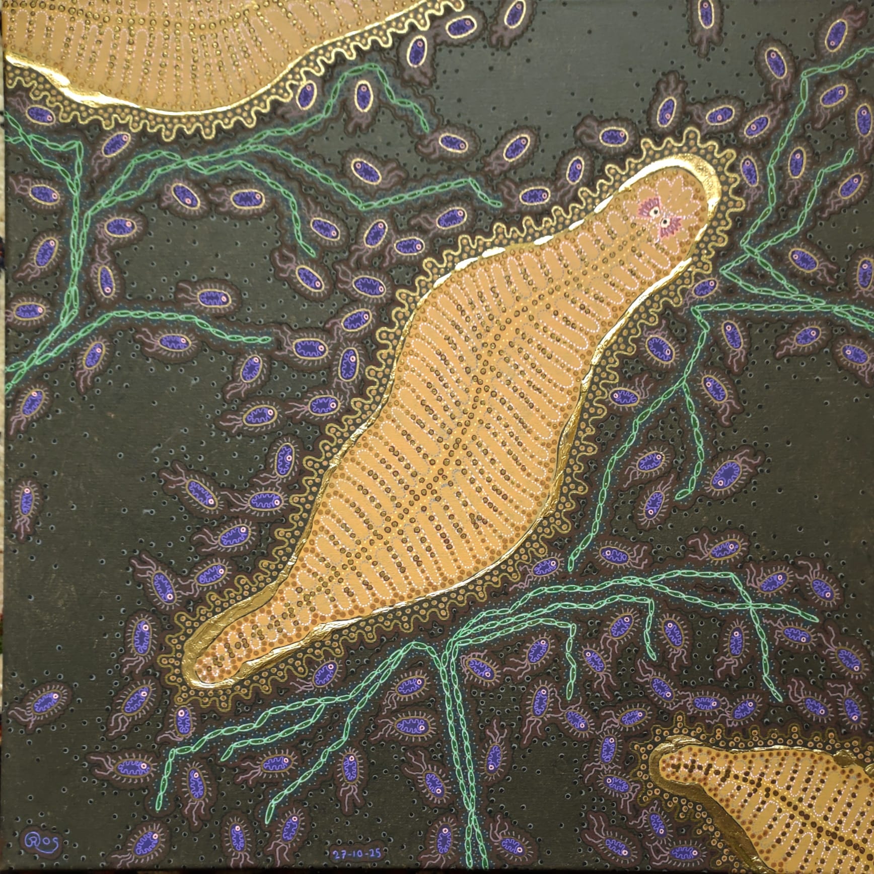La obra de Roswitha Althoff nos invita a reflexionar en la existencia de este universo marino invisible, mediante un lenguaje pictórico lúdico. Sus pinturas nos hablan del nivel organizativo y cooperativo de las colonias micro orgánicas y de su interacción universal con elementos de mayor tamaño en nuestro campo visual, como el mar, el sol o la luna.