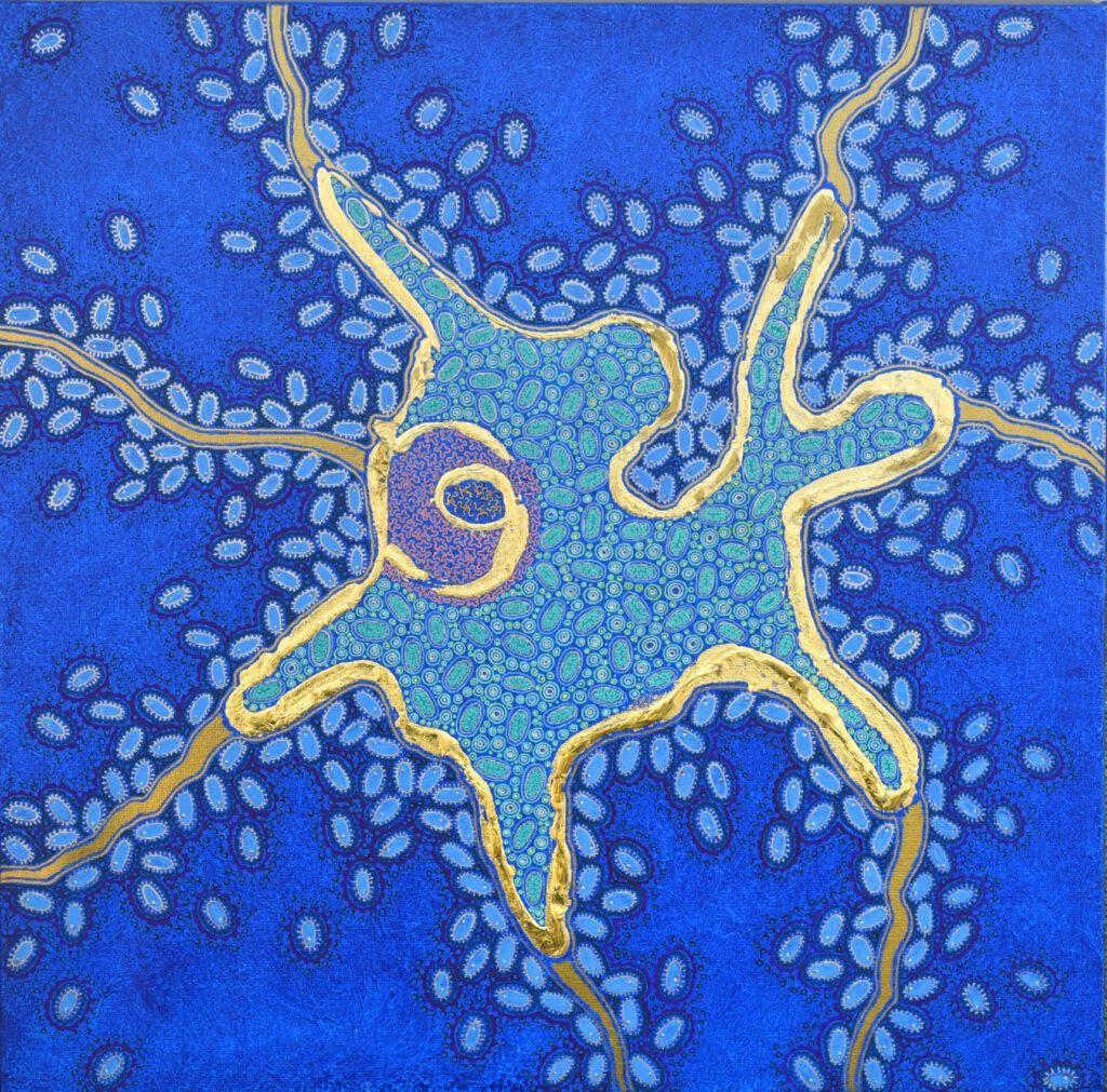 Estrella de mar desprendiendo sus brazos, 50x50cm, acrílico y hoja de metal sobre lienzoLa vista de las Vieiras, 50x50cm, acrílico sobre lienzoAmeba estrellada, 50x50cm, acrílico y hoja de metal sobre lienzoPlanaria, 50x50cm, acrílico y hoja de metal sobre lienzo